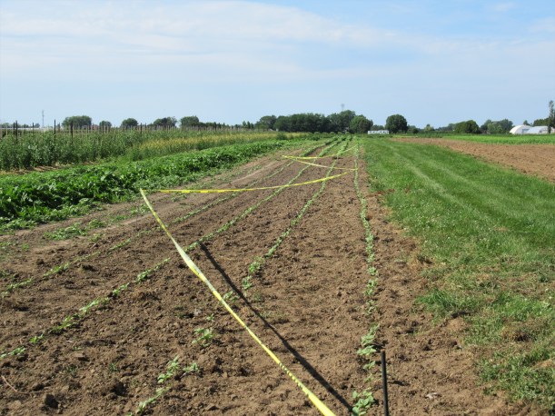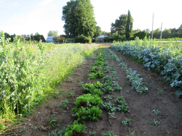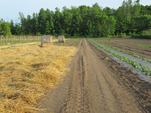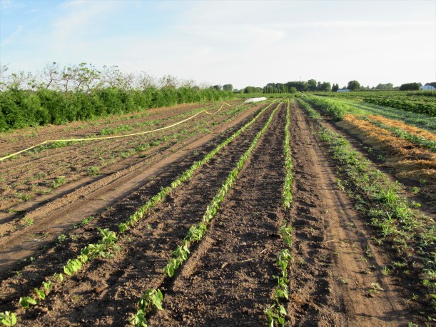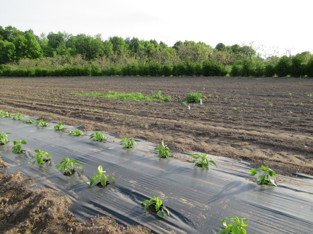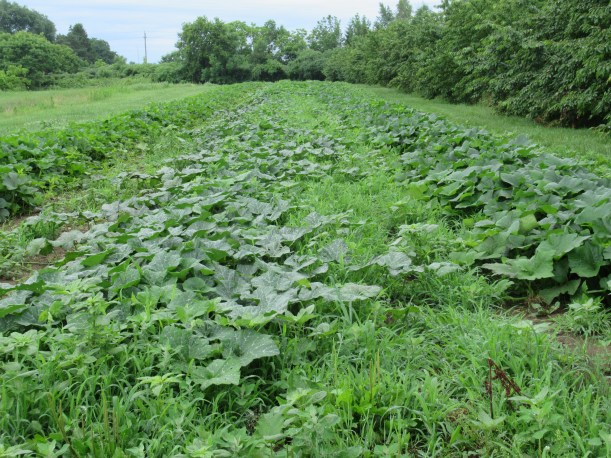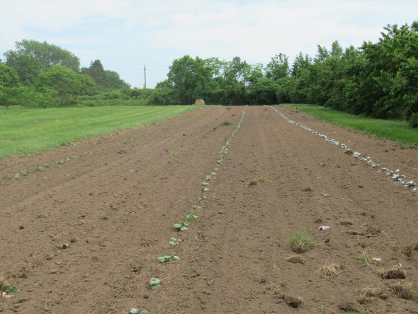 The zucchini plants that the insects ate are making a comeback (to the left in the picture) – some of them anyway, but of course the harvest is delayed. We also transplanted a new batch of zucchini plants into the field today.