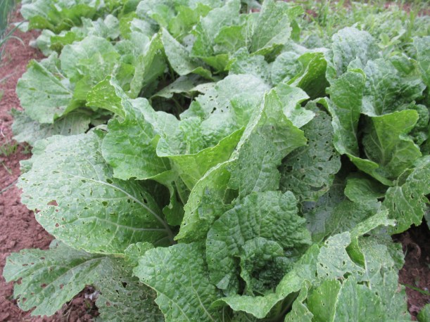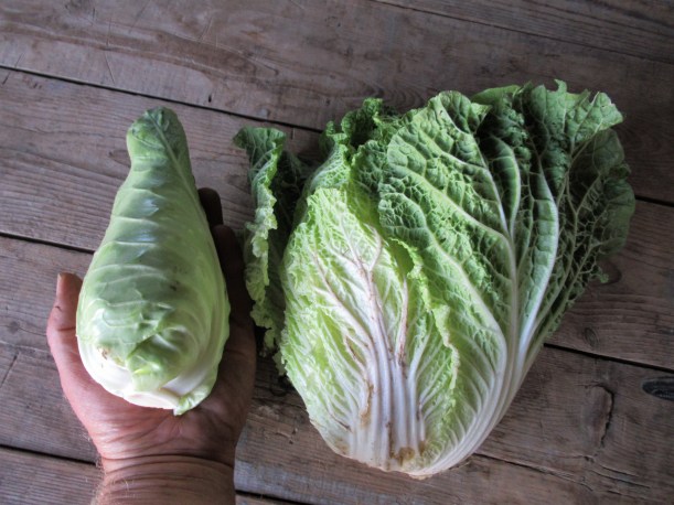 • Chinese (or napa) cabbages are also ready – sort of! While I expected to pick an abundance of these tender cabbages, many of them are still not filled out, while many are. So we’ll pick what we can and then also pick some regular cabbage too. Or almost regular! We have some little pointed cabbages that are about big enough to enjoy. These funny-looking but delicious morsels are just enough for a meal – no leftovers here! Both kinds of cabbage are great for salads, coleslaws or quick cooking.