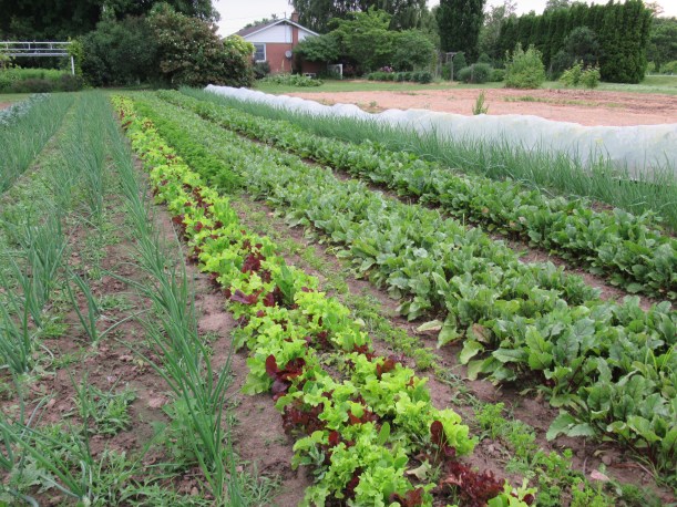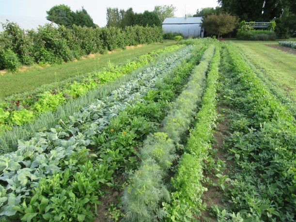 I was pleased to see that our vegetable rows are quite straight! Everything looks very green & lush.
