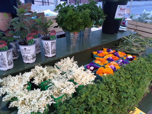Earlier on, we also offered elderflowers. These large white blooms are cooked with water, sugar and a bit of lemon, to make a simple syrup. This is added to drinks or used in baking. A market customer told us that back in the old country when she was a child, they would dip the entire bloom into pancake batter, then into hot oil to cook it, then into maple syrup, and then right into their stomachs! Delicious!