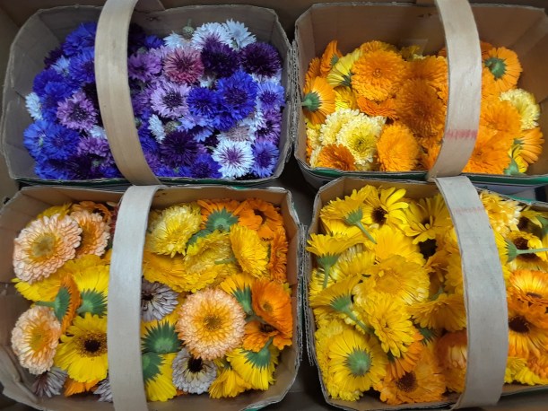 Yes, edible flowers! Calendula (pot marigolds) & Centaurea (bachelor’s buttons) mostly.