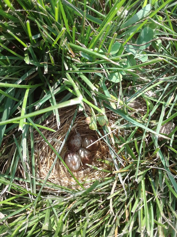 A little nest with 4 tiny eggs hidden in the grass, right on the ground. Lucky we didn’t drive over it!