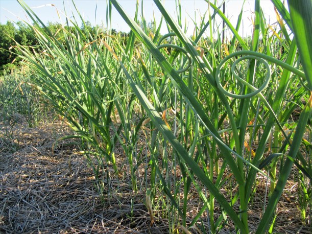 • There are always 3 chances to enjoy garlic. Green garlic – the immature garlic plant – has been included in the box several times already. Later this month we’ll harvest the mature garlic plant, let the bulb air dry for several weeks and then it will be ready to enjoy by late August. In between these 2 stages we have garlic scapes, a favourite of many! The curly scape grows out of the top of the garlic plant, will open into flowers and then produce seeds. But they are usually cut off rather, so the plant’s energy goes into producing a better, tastier garlic bulb.