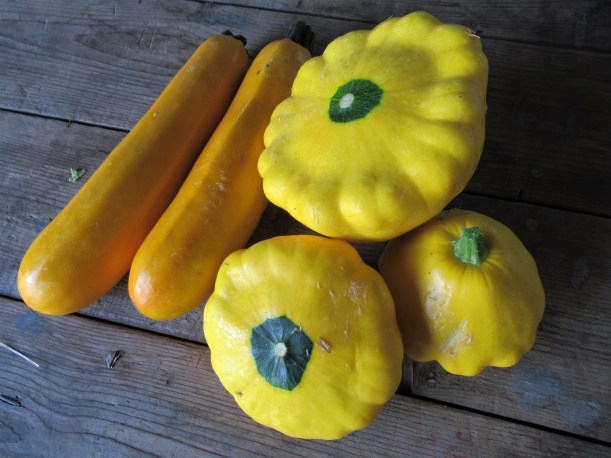 • We are finally picking zucchini! After the cucumber beetles decimated so much of the patch, enough came back to produce a (smaller) crop. The bad news – for zucchini traditionalists – is that we have no green zucchini. They were the preferred food for those hungry insects. The golden zucchini made a remarkable come-back, and the patty pans were mostly spared. So yellow it is!!