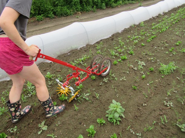 We made some good progress on the weeding today. Here’s Amy using our finger-weeder. Timing is critical with this tool (it only works on very small weeds, when the vegetables are small too) but properly used it can save a lot of hand weeding.