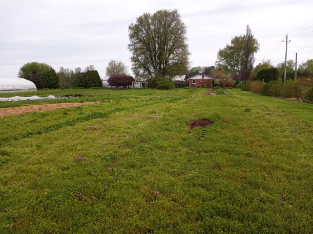 Using plastic is never our 1st choice. We much prefer straw. Straw holds the moisture in the soil better, and it decomposes, adding organic matter and improving the soil. It is also expensive to buy and takes a lot of time & expense to spread. Those pesky weeds also grow through it by mid-summer. Groundcover is less expensive, easier to lay down (though it will require work to remove it in fall) and promises to last for 5 years or more. So we thought we would give it a try.