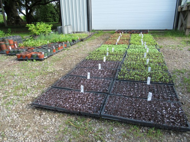 This is a view of the area in front of our workshop/greenhouse. Rows of plug trays filled with seeds & seedlings, trays of pots also containing seeds – some germinated, others newly planted.