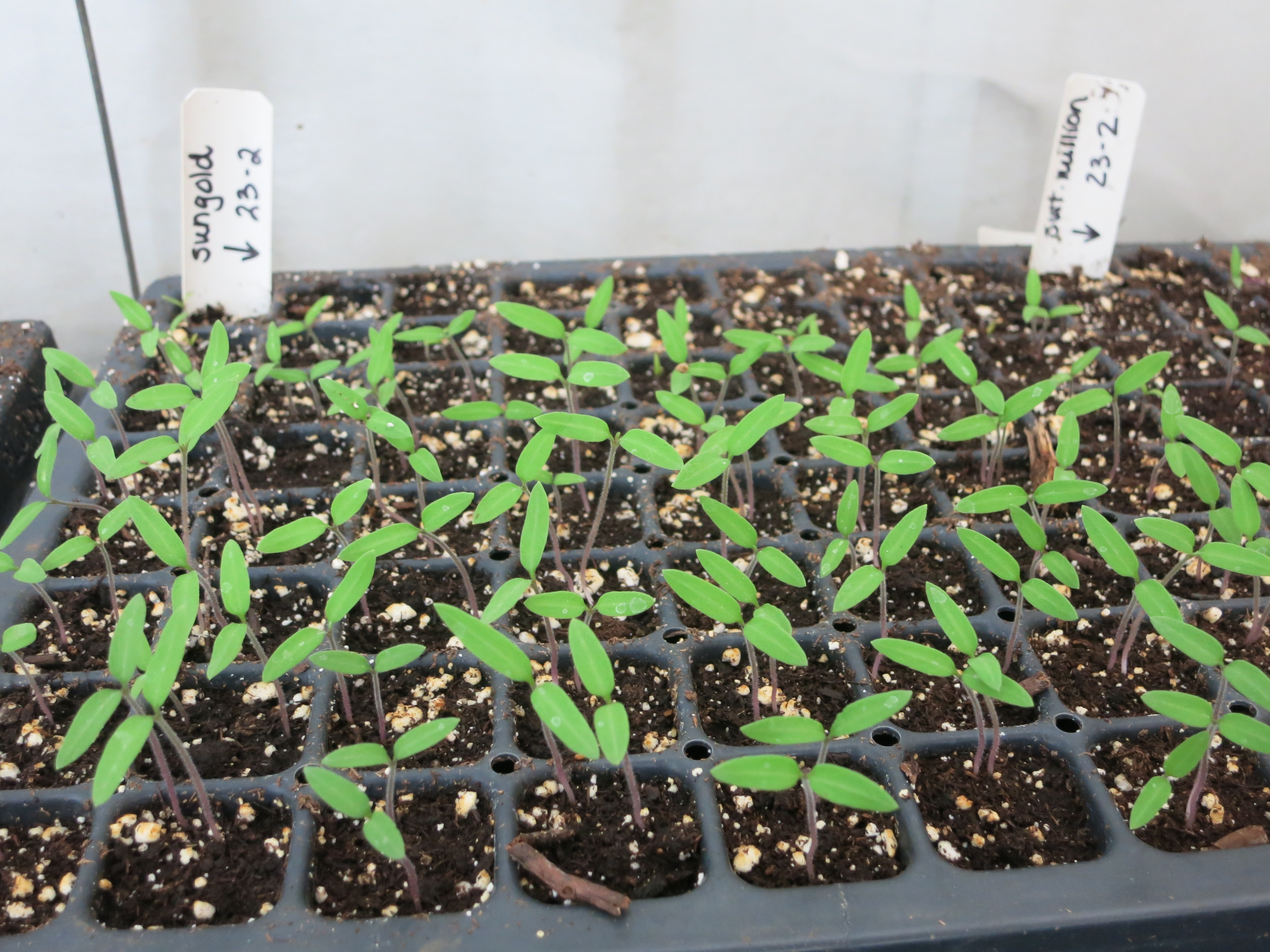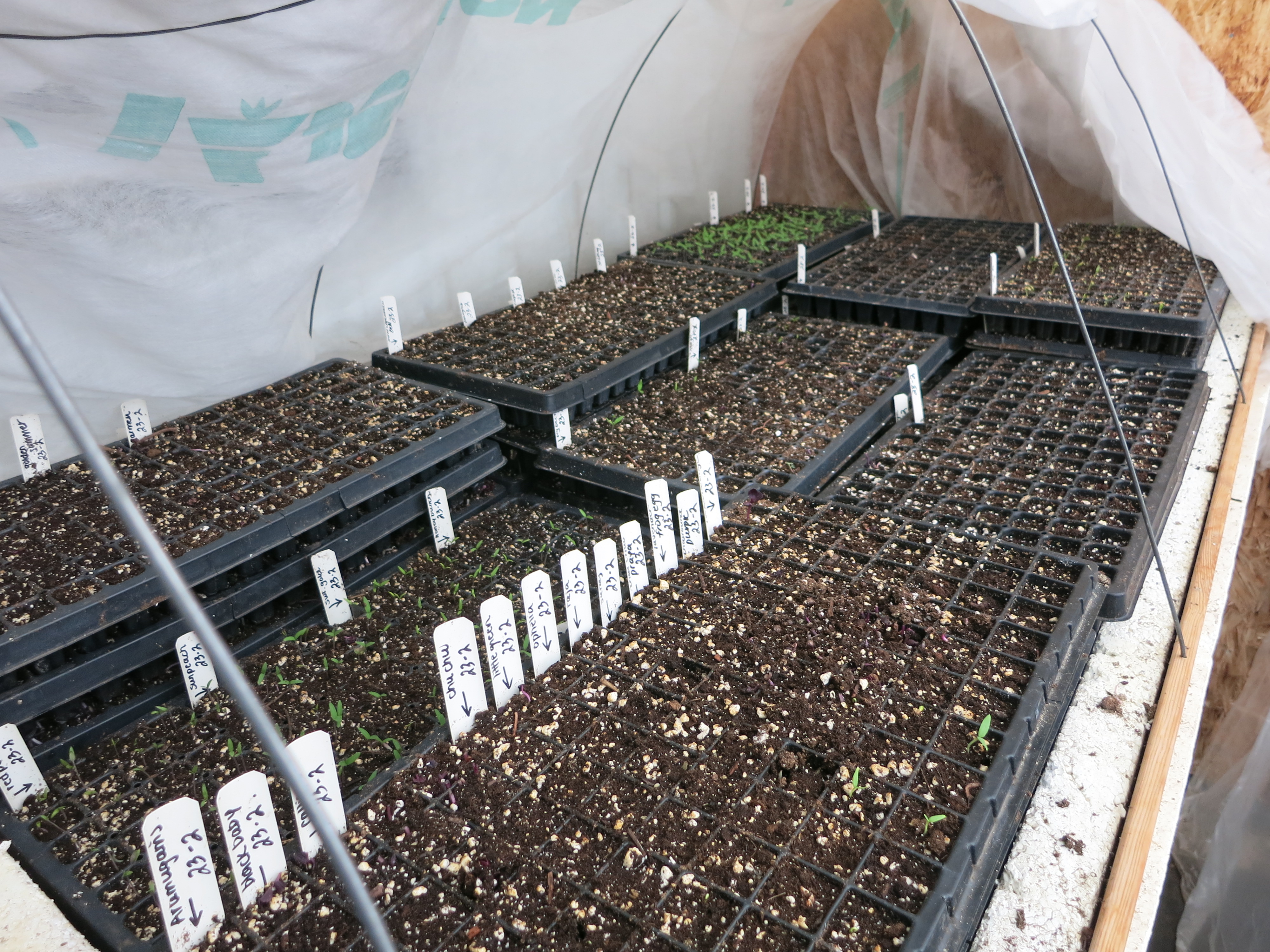 They are growing under row cover, under plastic, in a greenhouse – 3 layers of protection. The last bit of insurance is a space heater which kicks on during the night. Not perfect conditions nor elegant, but the results are sturdy little plants that will produce delicious vegetables this summer!