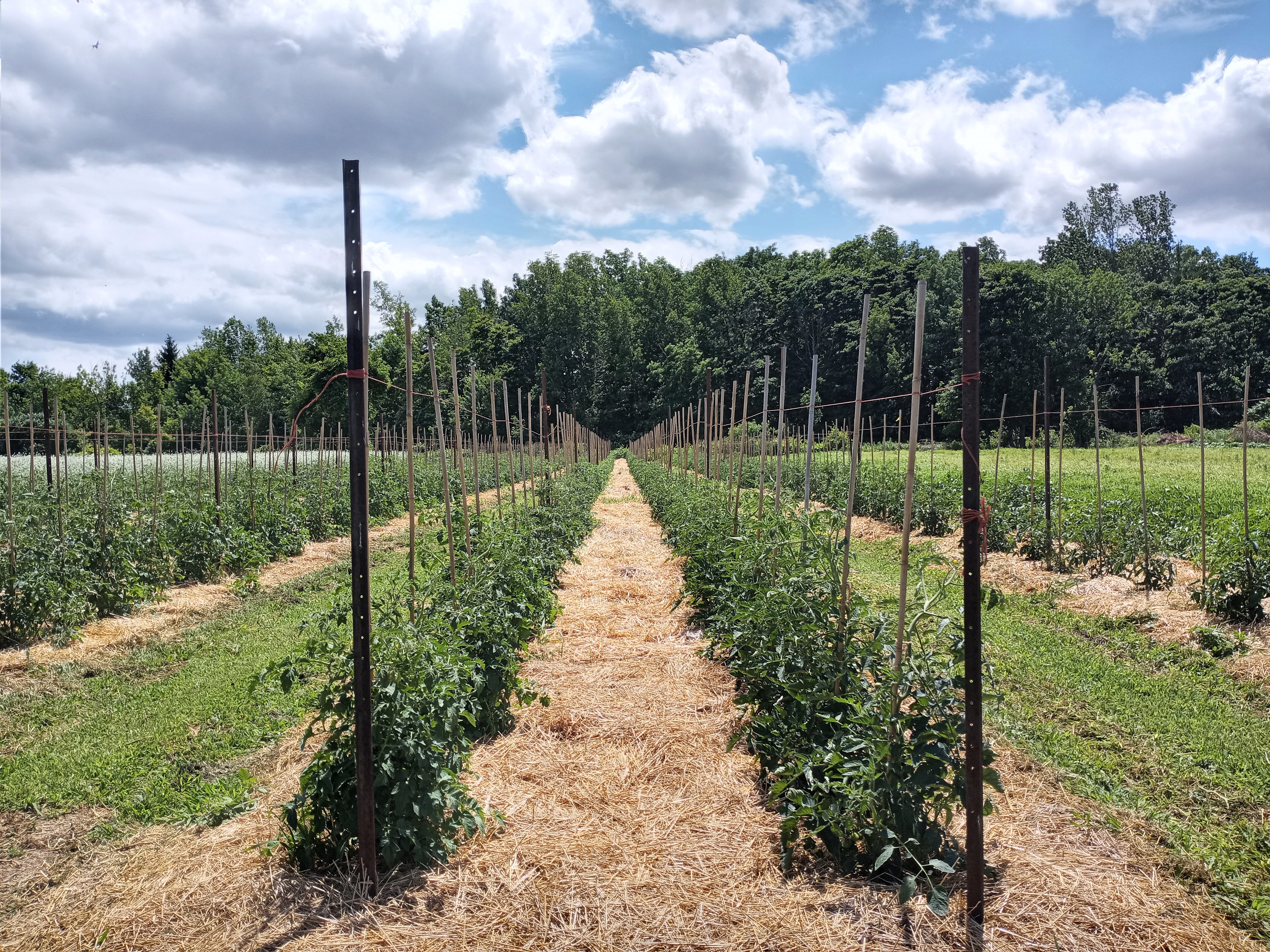 In a season without rain we realize that our efforts to improve our soil are paying off. Our soil holds moisture longer because we have added organic matter with our cover cropping, and use manure & compost instead of chemical fertilizers. We have reduced our tillage, keep the ground covered with something growing most of the time, and use a lot of mulch. Without these measures I know our crops would not be growing as well as they are, and we would be purchasing even more water.