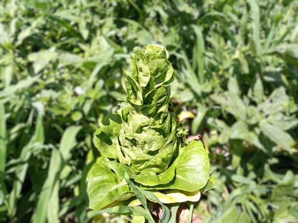 This is one of our favourite kinds of romaine. The other day these were small, perfectly formed round heads. Now they have stretched tall & lean due to the heat. We will leave them in the field for the groundhogs to enjoy.