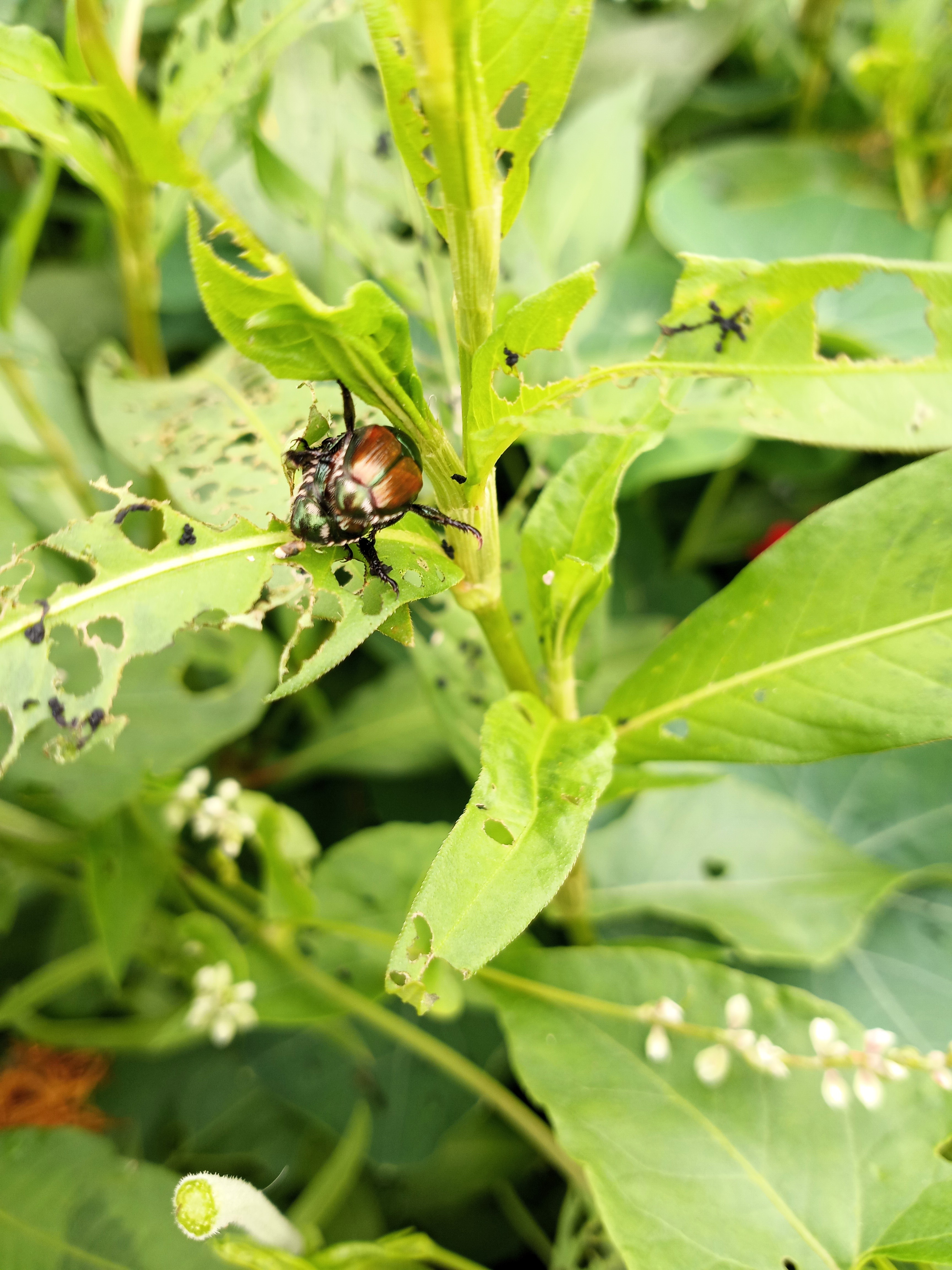 It is Japanese beetle season. Right now they are mainly feasting on weeds in the edible flower rows – so that’s good! But they also enjoy edamame. There are plenty in the blackberries as well, but hopefully not causing too much damage.