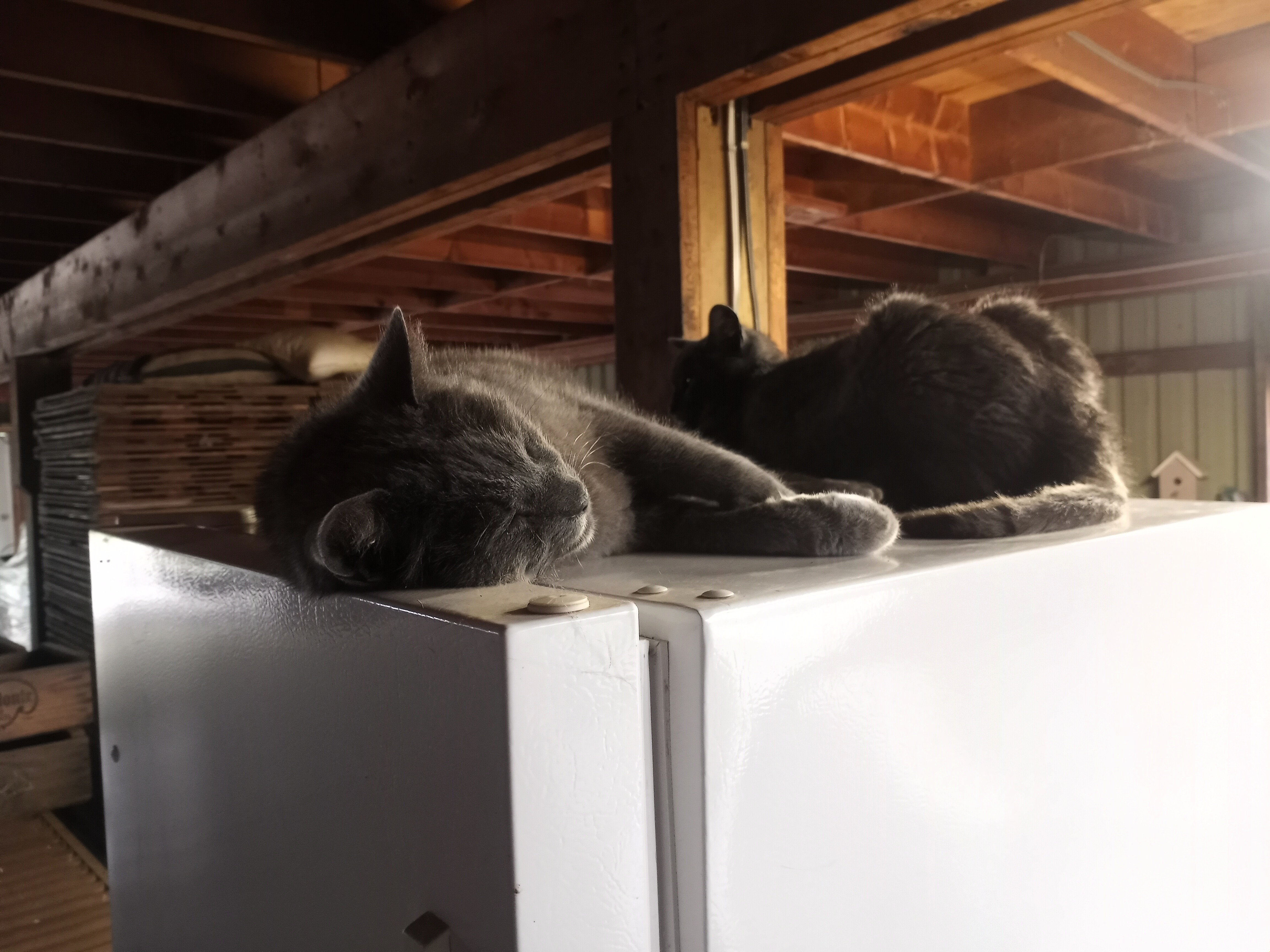 These 2 smarties figured out that a bit of cold air leaks out of the cold storage under the door – so that’s where they hang out!