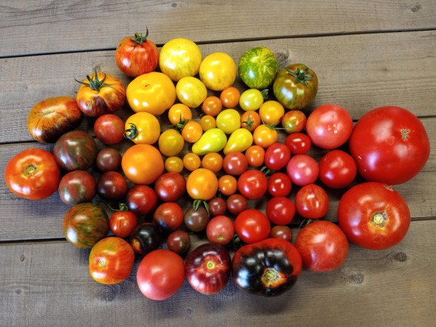 It is the peak of tomato season. This year we are growing more than 60 varieties of all sizes & colours. Here’s what some of them look like …