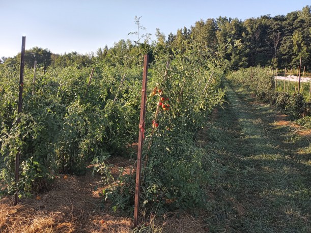 The tomato patch is out of control! It’s a bit of a jungle out there. The plants are surprisingly healthy as of now, despite the lack of rain, and continue to grow vigorously – cherry tomatoes especially. The heavy, fruit-laden plants are sagging and leaning, stretching the string that holds them upright to the limit. And the tomatoes sure are good!